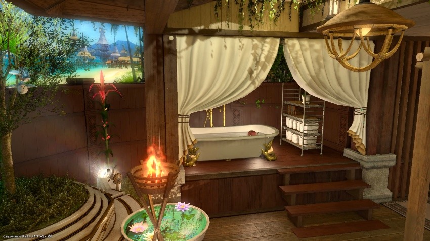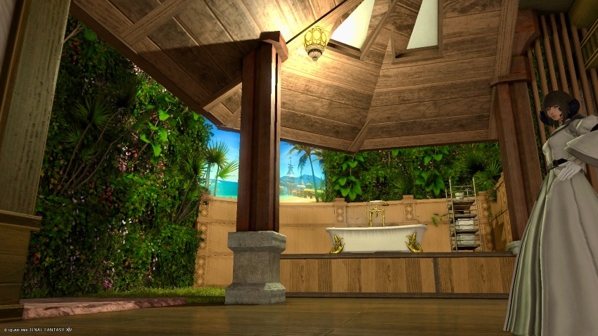 気合いと根性でマジックランドスケープ・コスタとバスタブを浮かせて(おまけに店売りの棚もw)グリーン・パーティションでぐるっと囲むと、さすがにお風呂から丸見えはよろしくないよね?って事で、ザナラーン・カップボードを店売りで買って裏側に置いて仕切ってみたり。